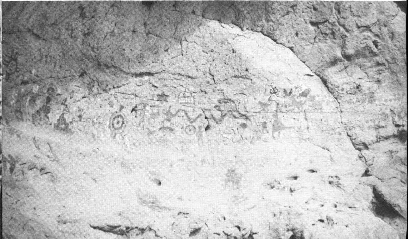 A final feature of particular interest in the back country of the monument is the Painted Cave. This art gallery in the cliffs decorates a canyon wall some 12 miles from headquarters. Once a large population inhabited this canyon of Capulin Creek, but most of the evidences of habitation have vanished except for the extensive pictographs on the weatherproof back wall of the Painted Cave. The 15 arch of the cave is shallow but wide, so that a smooth area over 50 feet long was available to the artists; several dozen drawings in a variety of reds and blacks adorn this surface. It is probable that many generations of artists used the cave, since space finally ran out and later drawings are superimposed on their faded predecessors. Moreover, evidence of historic, or post-Spanish, artistry is here—a sketch of a conquistador on horseback, another of a mission church complete with cross.