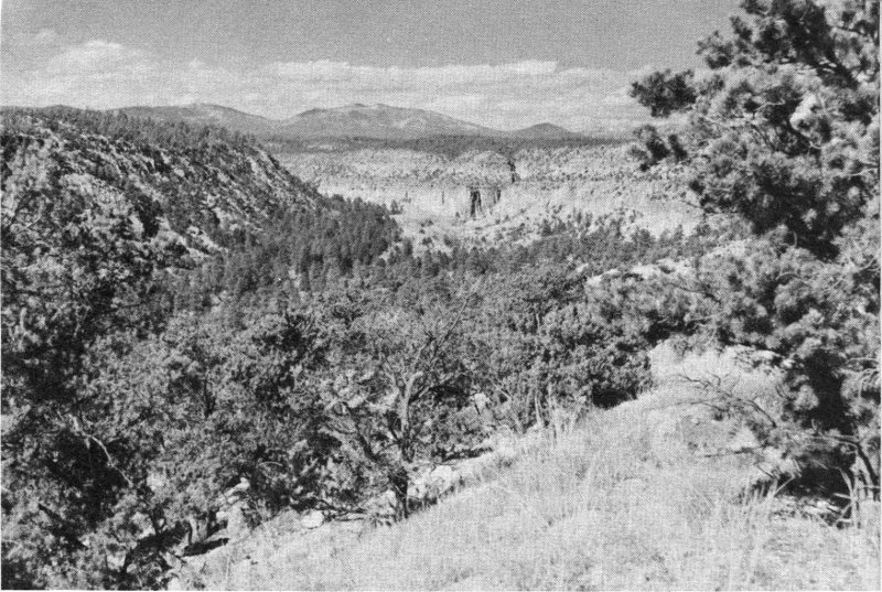 The countryside in and around Bandelier National Monument is wholly forested and even in dry months is cool and green. Lying at an elevation of nearly 7,000 feet, about one-third of the monument receives sufficient rain and snow to support a handsome stand of ponderosa pine. Over the remaining two-thirds of the area, where the slopes are too warm and dry for the big pine, the hardy pinyon pine and the juniper produce the “pygmy forest” growth common in the middle elevations of the Southwest.