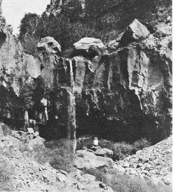 4. The Upper Falls are downstream from headquarters about a mile and a half. The trail follows the Rito down through some of the handsomest forest glades on the monument, crossing the stream several times. The falls, in a deep lava cleft, are about 80 feet high. The Lower Falls, a quarter-mile farther down, are only half as high. Along the trail between the two falls, a geologically interesting exposure of the canyon wall is conspicuous.