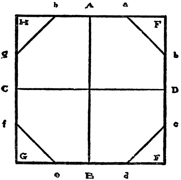 With the dividers take us many spaces (6) from the scale as there are inches in the width of the stick, and lay off this space on either side of the point A as Aa and Ab; lay off in the same way the space from the point B as Bd and Be; also Cf and Cg and Db and De. Then draw the lines ab, cd, cf and gh. Cut off the solid angle E, also F, G and H; there is left an octagon, or “eight square” stick. This is nearly exact.