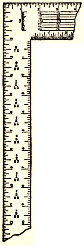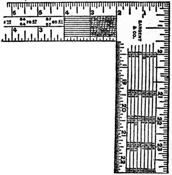 The next thing to be considered is the use of the figures, lines, and scales, as exhibited on the square. It is supposed that the ordinary divisions and sub-divisions of the inch, into halves, quarters, eighths, and sixteenths are understood by the student; and that he also understands how to use that part of the square that is subdivided into twelfths of an inch. This being conceded, we now proceed to describe the various rules as shown on all good squares; but before proceeding further, it may not be out of place to state, that on the squares recommended in this book, one edge is subdivided into thirty-seconds of an inch.