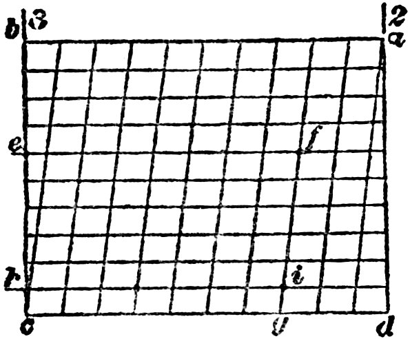 I show the complete square, reduced to page size. Sometimes this square is catalogued by dealers as No. 1000, practically, however, it is the same square as the No. 100. If we examine this square we will find on the tongue near its junction with the blade a series of lines and cross lines (see Fig. 4), making a figure known as the “diagonal scale.” This scale is drawn to a larger size at Fig. 5 and is shown alone and is used for taking off the hundredths of an inch. The line ab is here an inch long, and is divided into ten equal parts; the line cd being also divided into ten equal parts, and diagonal lines are then drawn connecting the points as shown in the diagram. Suppose we wish to take off 76-100 of an inch, we proceed as follows: Count 23 off seven spaces from c, e, g, which equals 70-100 of an inch; then count up the diagonal line until the sixth horizontal line, e, is reached, when e f will equal the required distance of 76-100 of an inch, which is a trifle over ¾ of an inch.