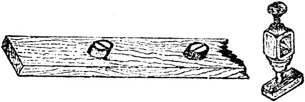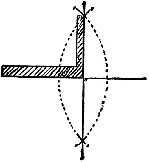 Now run parallel lines off the tangent B for the shank; this completes the face mold, which is now ready for the face of the plank. Wreaths for stairs with flights which stand at either acute or obtuse angles to each other may be set out by the methods that have been here described. The only difference, practically, is that the bed block is made acute or obtuse to suit plan of tangents. The device shown at Fig. 85 has been found to answer excellently for striking out ellipses. To make this, procure two screws ¾ inches long, also a piece of brass tube that will just slip on the plain part of the screw without shaking. Counter sink out the ends until the screw heads are flush; cut two pieces off the tube three-sixteenths and file up true—these pieces are best held by sinking them with a bit in a piece of hardwood. Now when about to strike an ellipse, drive these screws in with the collars on to half major and 125 minor, measured from the point of the trammel to the inside of the collar for the major, and to the outside of the collar for the minor. It will be found that if the collar has been made true, the trammel will slip around the curve without causing the square to slip about, the collars acting as rollers.