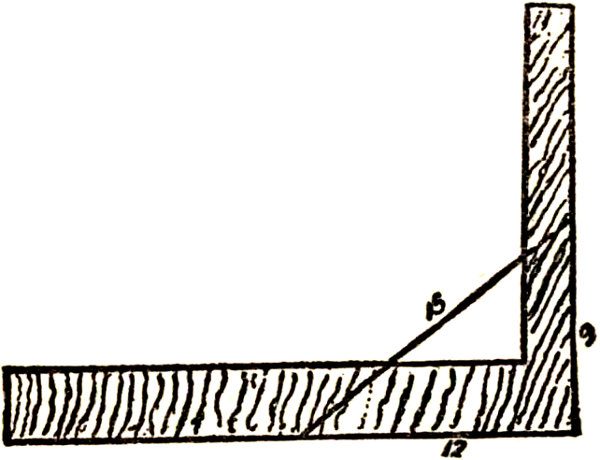 Prepare a piece of stuff, same as the one operated on for four feet run; joint and gauge it. Lay the square on the left-hand side, keep the 12-inch mark on the tongue, over the gauge-line; place the 9-inch mark on the blade, on the gauge-line, so that the gauge-line forms the third side of a right angle triangle, the other sides of which are nine and twelve inches, respectively.