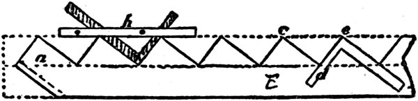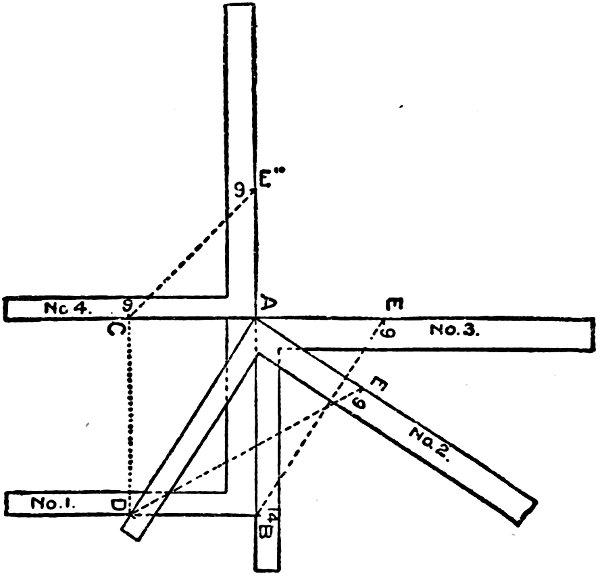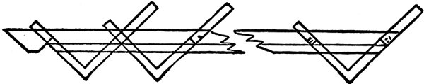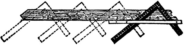 It may be necessary to state that the “square,” as now arranged, will lay out a brace pattern 111 for any length, if the angle is right, and the run equal. Should the brace be of great length, however, additional care must be taken in the adjustment of the square, for should there be any departure from truth, that departure will be repeated every time the square is moved, and where it would not affect a short run, it might seriously affect a long one.