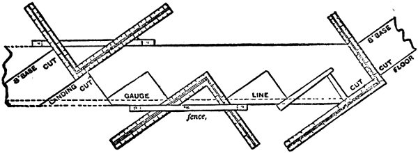 Now proceed as on the former occasion, and as shown at Fig. 74, taking care to mark the 112 bevels at the extreme ends. The dotted lines show the position of the square, as the pattern is being laid out.