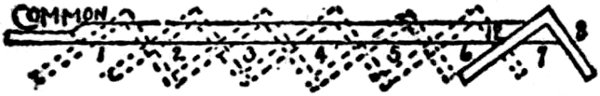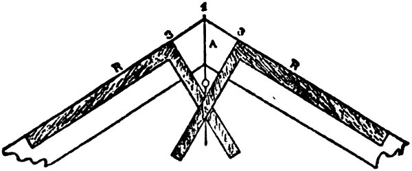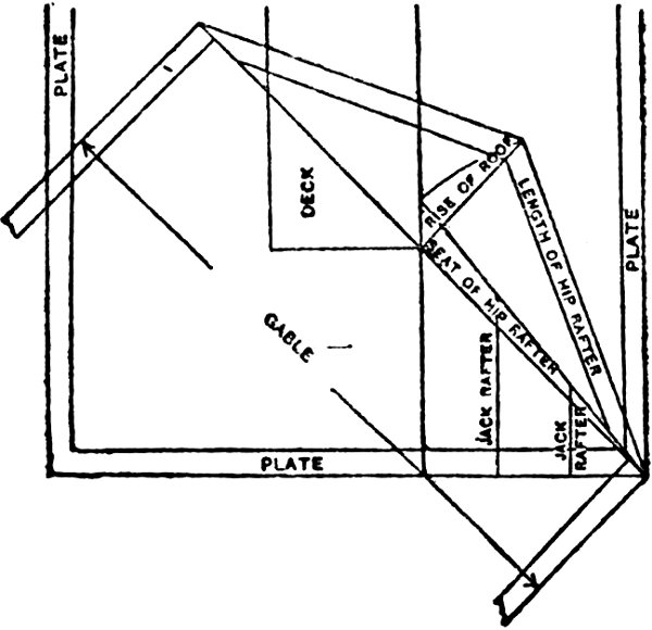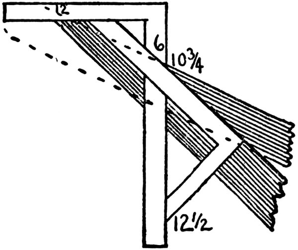 This Division shows how the Square may be used for obtaining the cuts, bevels, and lengths of all sorts of rafters for roofs of every description. It also shows methods for finding Hopper and other bevels, brace cuts and lengths, and raking cornices.