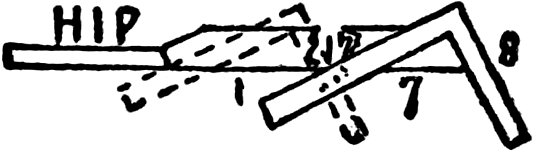 On the sixth line under 8 are the figures 9 and 10. By placing square on stock to be cut at these figures, 9 on body and 10 on tongue, and marking on the 10 side, this gives side cut of hip or valley rafter against ridge board or deck.