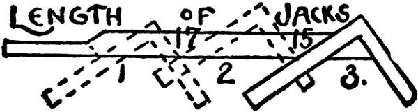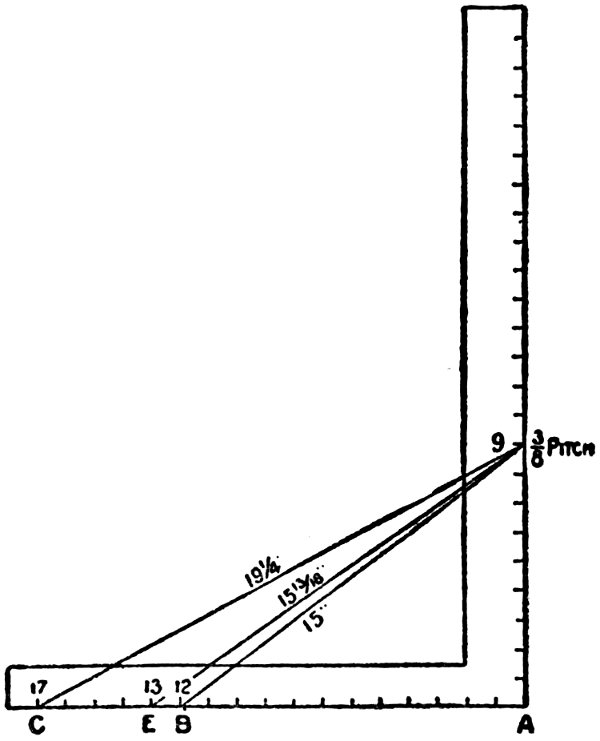 3. On the third line under 8 are the figures 19¼ inches. This is the length of first jack rafter, also the difference in the length of the others spaced 16 inches on centers. For example, the first jack being 19¼ inches, the second jack would be 3 feet 2½ inches; make each one 19¼ inches longer than the other.