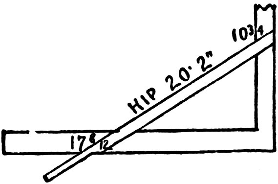 To obtain the bottom and top cuts of hip or valley rafter use the figure 17 on body, and whatever figure your roof raises to the foot on tongue. This will give you the correct cuts in all cases.