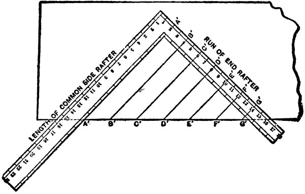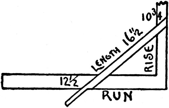 Quoting from the table of directions given in Sargent’s circular describing this square, we have, for rafter cuts, the following explanation: “This run of a rafter set up in place is the horizontal measure from the extreme end of the foot to a plumb-line from the ridge end—from A to B, Fig. 6.