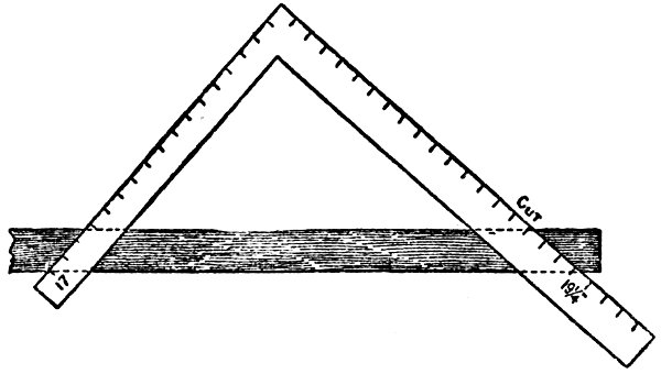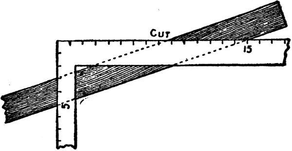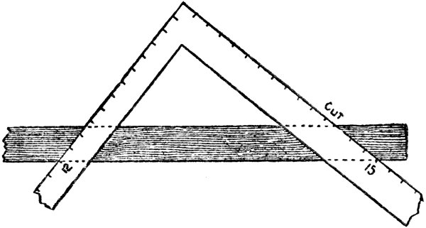“The cuts or angles of a rafter are obtained by applying the square so that the 12-inch mark on the body and the mark on the tongue that represent the rise shall both be at the edge of the rafter. The illustration, Fig. 9, shows 8 foot rise, the line A the cut for the ridge end of the rafter and B the cut for foot end.”