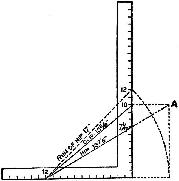 This is all the figuring necessary to be done. The reason for giving the lengths for one foot of common and hip or valley rafters is that it 16 will work in all cases regardless of width of buildings.