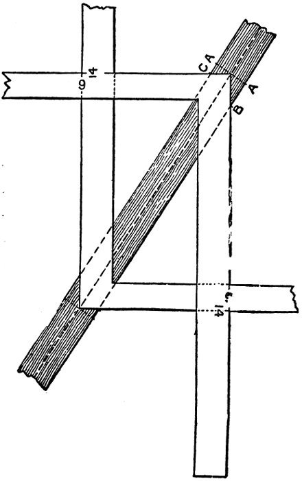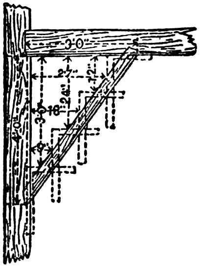 In the first place it is always best to make a pattern and then mark out the timber work from the pattern. Suppose we want braces having a “four-foot run”—that is, the brace is to form a diagonal from points four feet from the post and four feet from the girt. Take a piece of stuff already prepared, six feet long, four 109 inches wide and half-inch thick, gauge it three-eighths from jointed edge.