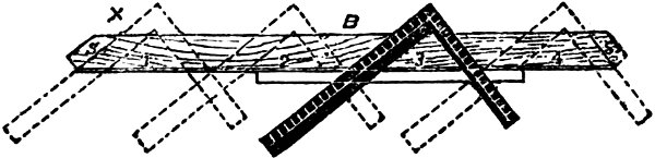 To test this question, get a board, about 12 or 14 inches wide, and four feet long, dress it on one side, and true up one edge as near straight as it is possible to make it. Lay the board on the bench, with the dressed side up, and the trued edge towards you, then apply the square, with the blade to the left, and mark across the prepared board with a penknife blade, pressing close against the edge of the tongue; this process done to your satisfaction, reverse the square, and move it until the tongue is close up to the knife mark; if you find that the edge of the tongue and mark coincide, it is proof that the tool is correct enough for your purposes. Later on, I will show by diagram how this test is performed.