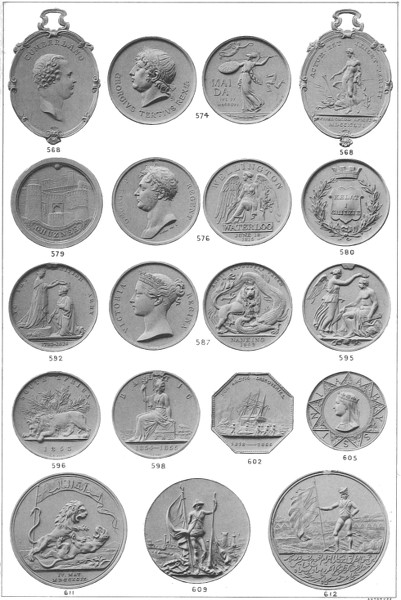 Again a long period elapses during which no decorative medals appear; and the victories of the Nile and Trafalgar would have remained unrewarded, but for the munificence and patriotism of two Englishmen, Alexander Davison and Matthew Boulton (see Nos. 539 and 544). In 1784 the East India Company acknowledged the services of its troops by awarding a medal for the campaign in the West of India, an example which originated a custom; and from that time, as long as India remained under the control of the Company, medals were awarded for all subsequent wars. The first medal issued by authority in England in this century is that given for the battle of Waterloo. It was conferred by order of the Prince Regent upon every officer and private present at that battle; but no acknowledgment was made of all the brilliant engagements in the Peninsular War till 1847, when a medal was issued for military services between the years 1793—1814 (No. 592). At the same time a corresponding medal for naval services was ordered to be struck for all naval engagements during the same period.