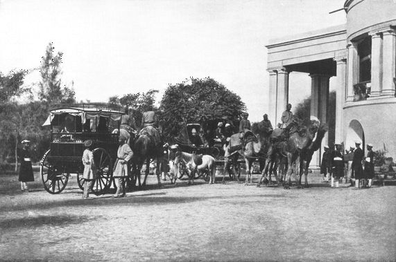 At the stations, we were met in different parts of India by the greatest imaginable variety of conveyances—carriages with footmen and drivers in state livery, sent by the native princes, hotel and public carriages after models never dreamed of in America, bullock carts, elephants, camels, 30 rickshaws, and, in Calcutta and Bombay, taxi-automobiles.