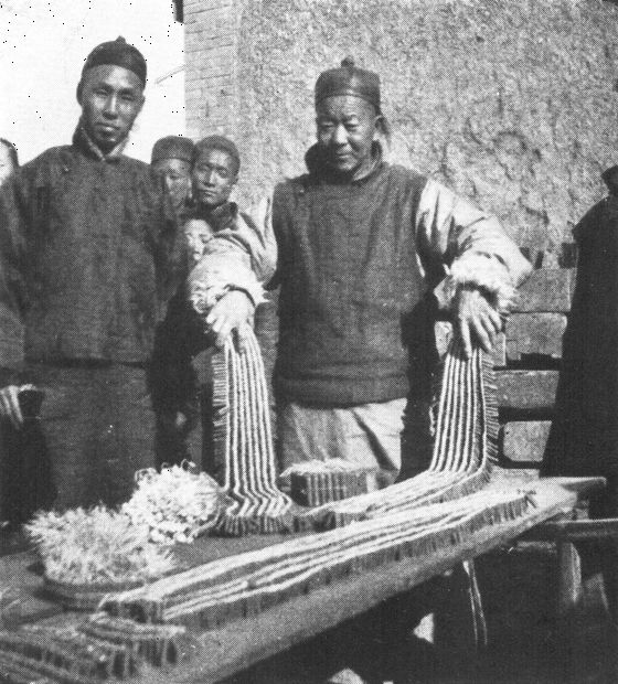 Shortly before ten o'clock a large number of aged porters meet in a room of the weigh-house, and soon emerge dressed in scrupulously clean white trousers and shirts, with black slippers and straw hats. The hats are of blue, green, yellow, red, or other bright colors, with ribbons of the 166 same shade hanging down behind; and the men wearing the same colors work together in pairs.