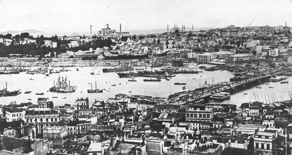 Stamboul is the old part of the city, where many different peoples have dwelt—first Greeks, then Romans, now Turks, and you can still see by a bit of a house or an old wall how these people lived. Galata is where English, French, Italians, and Germans carry on their business in Turkey, and where the big boats unload their cargoes. Between Galata and Stamboul is one of the most famous and most crowded bridges in the world. Pera is where most of the Europeans live.