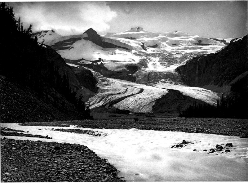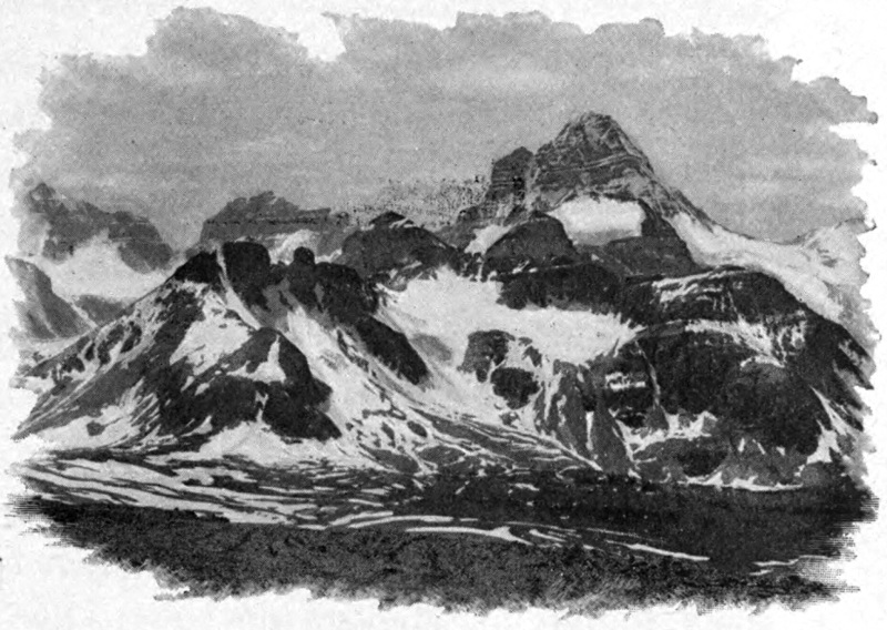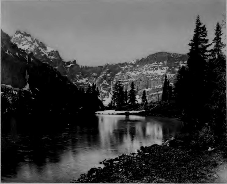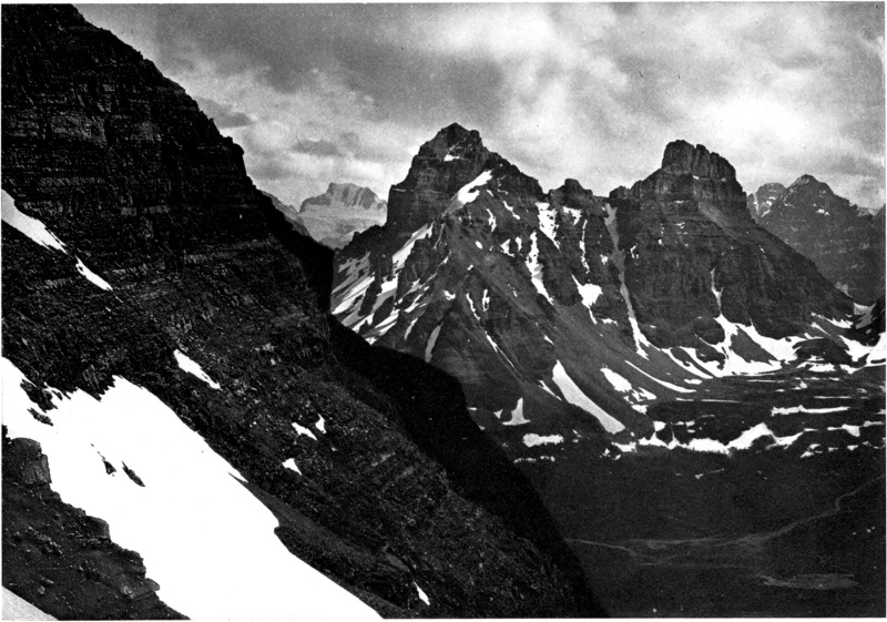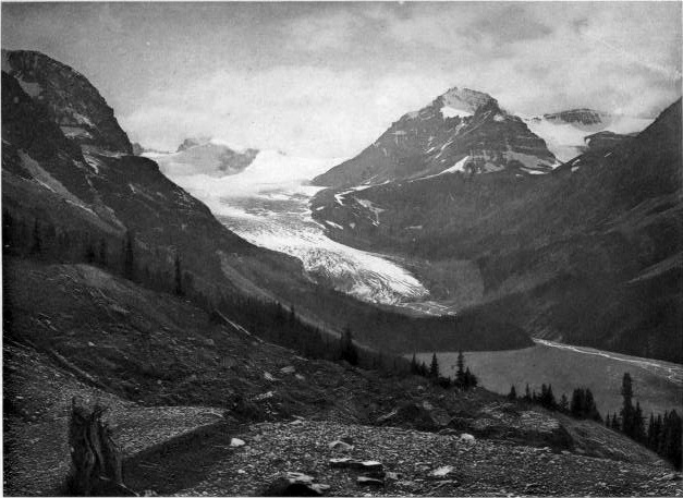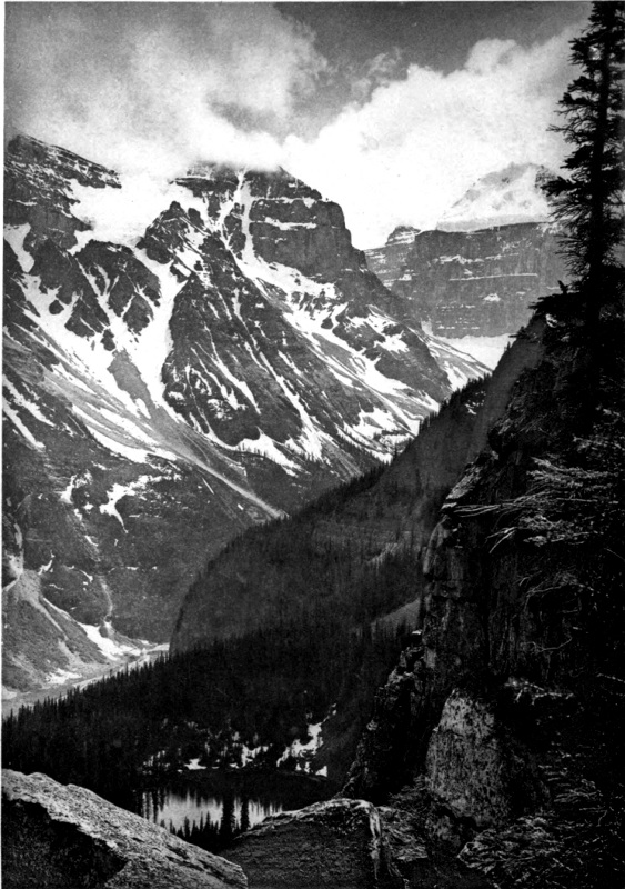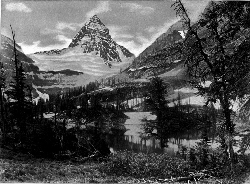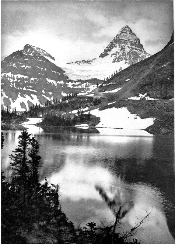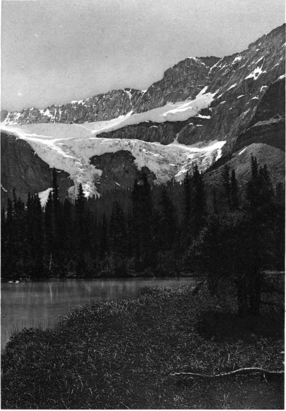 It would be difficult indeed to give even a partial description of the scene. Imagine a cool morning with the rising sun just beginning to touch the surface of a mountain lake. The air is tranquil and calm so that the glassy surface of the water mirrors the sky and mountains perfectly. 18 In the realm of sound, too, all is repose but for the call of birds near at hand among the balsam trees. From the shores of the lake on either side rise great mountains, showing cliffs and rocky ledges or long sweeping slopes of forest to the tree line. Higher still are bare slopes, crags, ledges, and scattered areas of snow. At the end of the lake a great notch in the nearer mountains reveals at a distance the wall-like, lofty mass of Mount Lefroy. This most imposing snowy mountain stands square across the gap, and with a sharp serrated cliff piercing the very vault of heaven, shuts off the view and forms the most conspicuous object of all. The lower part of the mountain is a vertical cliff or precipice where the longitudinal strata are distinctly visible. Above, rise alternating slopes covered with perpetual snow and hanging glaciers, the white-blue ice of which is splintered by deep rents and dark yawning crevasses. This mountain forms part of the continental water-shed, for on the other side the melting snows finally reach the Pacific Ocean, while on the near side the snows swept into the valleys by avalanches, and melted by the warmer air of lower altitudes, find their way at length into the Saskatchewan River and Hudson Bay.