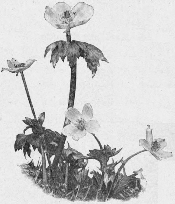 Our attention finally came to the quiet beauty of the surrounding vegetation, where among the scattered skirmishers of the forest are flowering shrubs, and in the more open grassy places forming the swampy borders of the lake, are many bright flowers. The white mountain anemones in several varieties, the familiar violets, the yellow columbine with beautiful pendent blossoms claiming relationship to its Eastern cousin with scarlet flowers, the fragrant spiranthes, and orchids with pale-green flowers, resembling insects on a leafy stem, may all be seen in profusion near the north side of the lake. These humble herbs, with their gaudy coloring, are the growth of a single season, but on all sides are copses of bushy plants which endure the long winter, some of them clad in a garb of evergreen and, like the annual plants, bearing elegant floral creations. The most conspicuous is the sheep laurel, a small bush adorned with a profusion of crimson-red flowers, each saucer-shaped, hanging in corymbs among the small green leaves. Various shrubs with white flowers, some small and numerous, others large and scattered, make a contrast to the ever present laurel, while the most beautiful of all is a species of mountain rhododendron, 20 a large bush, the most elegant among the mountain heaths, with large white flowers in clustered umbels. In early July this bush may be found, here and there, scattered sparingly in the forest in full blossom at the level of Lake Louise, but after this one must seek ever higher on the mountain side as the advancing summer creeps to altitudes where spring is later.