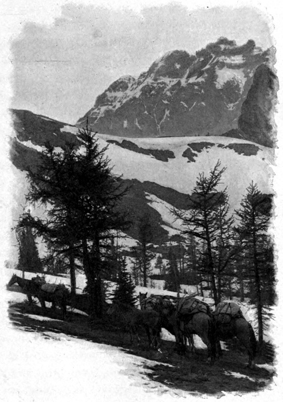 When Dr. Hector first came through this pass he had an adventure with one of his horses on this stream. They were climbing up the rocky banks of the torrent when the incident occurred. The horses had much difficulty in getting up, and in Hector’s own words, “One, an old gray, that was always more clumsy than the others, lost his balance in passing along a ledge, which overhung a precipitous slope about 150 feet in height, and down he went, luckily catching sometimes on the trees; at last he came to a temporary pause by falling right on his back, the pack acting as a fender. However, in his endeavors to get up, he started down hill again, and at last slid on a dead tree that stuck out at right angles to the slope, balancing himself 251 with his legs dangling on either side of the trunk of the tree in a most comical manner. It was only by making a round of a mile that we succeeded in getting him back, all battered and bruised, to the rest of the horses.”