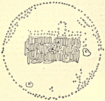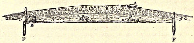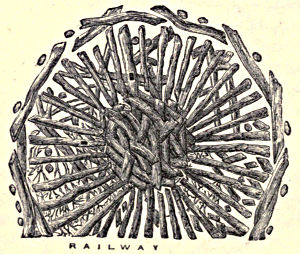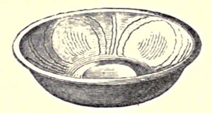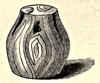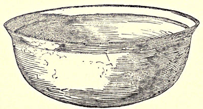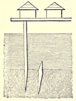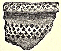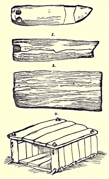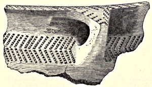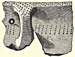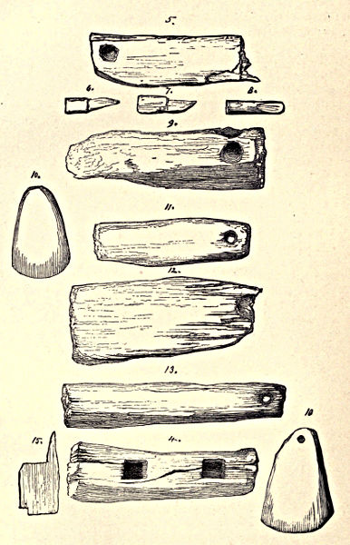 [246] The “finds” on Reed Island were, a whetstone, and fragments of another; a slab of sandstone (probably the hearth); a piece of iron, seemingly portion of some cutting instrument; a quantity of wood-ashes; a circular wooden noggin, with a small round handle; the handle of another vessel; some bright-red colouring matter, rolled up in a piece of birch bark. Near the outside piles were bones of the ox, sheep, and pig, all very much broken and gnawed.