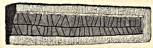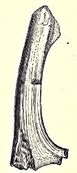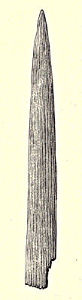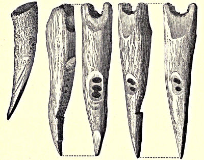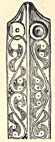 [256] The following “finds” from Ardakillen are deposited in the Museum, R. I. A.:—Numerous bone pins of various sizes and designs; twenty-two combs or fragments of same; a bone dart, six and a-half inches long; do., five and a-half inches long; do., four and three-quarter inches long; do., five inches long; a curved piece of deer’s horn, hollowed at the base, and another piece slightly longer; a tine of deer’s horn, hollowed at base; numerous harp-pins of bone (one is figured, ante, p. 125); a curious ovoid piece of bone, polished (ante, p. 105); the leg-bone of a deer, covered with carvings (plate XXXII.); a bronze brooch (ante, p. 117); a small slender torque-pattern ring (ante, p. 118); a bridle-bit (ante, p. 137); several whetstones; a very perfect, thin, narrow rapier-blade, double notches in handle-plate; beads of stone, bone, wood, porcelain, glass, and amber; numerous bronze pins; an oaken water-scoop, with a hollowed-out handle; a wooden mallet; some ogham-inscribed wooden objects.—Journal Royal Hist. and Arch. Assoc. of Ireland, vol. iii. (4th Series), p. 206.
