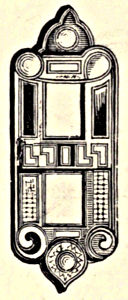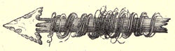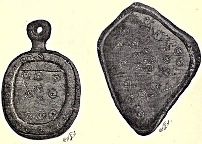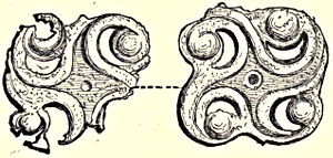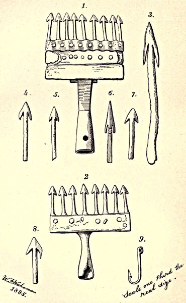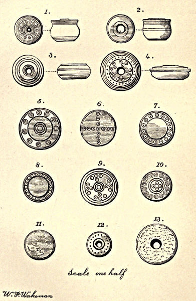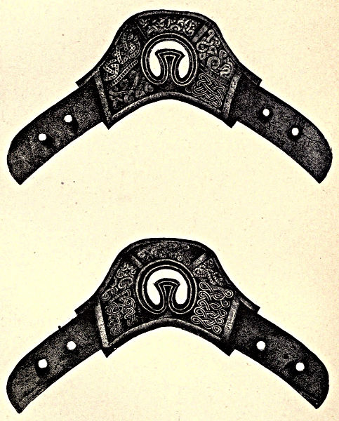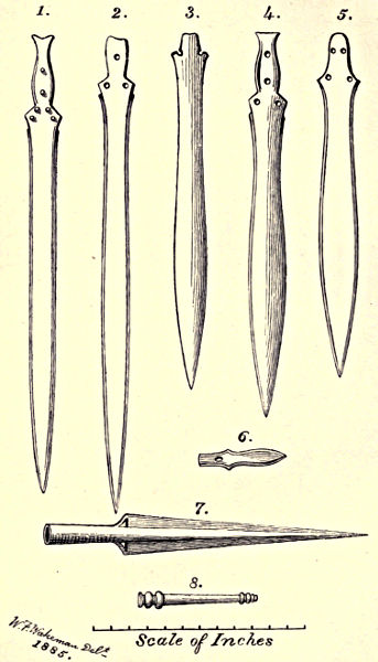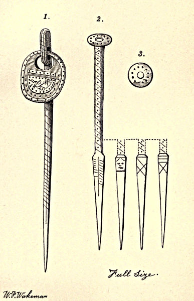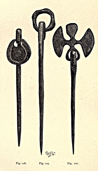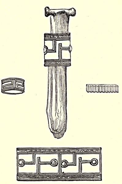 [228] And also the following antiquities:—A small stone, on which was carved a headless naked human figure. A sandstone ring. Several whetstones. A dark-coloured piece of shale and sandstone, three inches across, marked on the surface like the “game stones” in the Museum, R. I. A. A mould, formed of agalmatolite or potstone; on one side it had a circular cast for a harness stud. A decorated bone comb, and portions of eight others. Many curious bone pins (described ante “Articles of the Toilet,” &c.). A spatula-shaped bone (ante, p. 140). Flat pieces of ornamental bone (p. 139). A bone knife or skean, highly decorated on the handle and along a portion of the blade. A knife and fork of bone, colour dark brown; the handles are square, and decorated with the domino pattern. Several miscellaneous bone articles, consisting of pins, handles, knives, &c. Bronze tweezers, and several ornamented bronze pins. An admirably-designed brooch, or brooch-pin, of findruin or white bronze; its ring, two inches in diameter, was a mass of spiral ornamentation, pointing to an extremely early age. A very perfect short-bladed bolt-head, with narrow loops. A narrow dagger-blade, with high mid-rib and ridge on handle-plate. Amongst the iron remains there occurred, swords, varying in length from six to eighteen inches, axe-heads, spear-heads, shears, bodkins, and many small articles of domestic use.