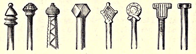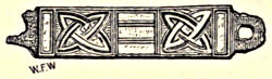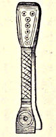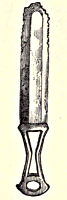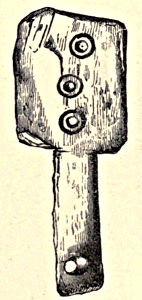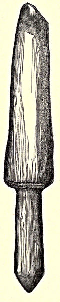 “Solinus relates that the Irish formed the handles of their swords from the teeth of large sea-monsters which they polished to a most beautiful whiteness.” “That the handles were very much smaller than those of modern swords with guards, and used for cutting as well as thrusting, there can be no doubt, yet some of them are large enough to receive a moderate-sized hand. Without discussing the generally received opinion that the men who used such swords had very small hands—like some of the Asiatics of the present day—the mode of using these weapons must not be forgotten. They were employed for stabbing and fencing, in which the middle, ring, and little fingers alone grasped the handle completely, while the thumb and fore-finger passed upwards on each side of the blade, fitting into the curved hollows of the hilt—and not like the method of the cavalry soldier of the present day, who, when about to deal a heavy blow, grasps his weapon with the closed hand, which must occupy a space of about four and a-half inches.”—Cat. Mus., R.I.A., p. 456.