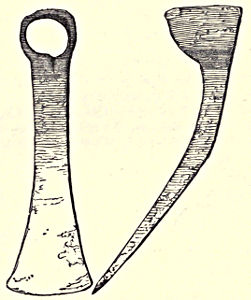 [196] In the kitchen-midden was the ordinary complement of bones, principally those of the ox, boar, sheep, goat, dog, and deer. Seven short scythes of bronze, a plough-sock of iron, a plough-share of flint, several iron spear-heads, and some pins, were also brought to light.