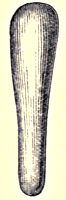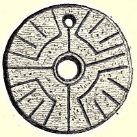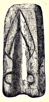 [220] In addition to the usual collection of bones, the articles obtained from the crannog were as follows:—A large stone, hollowed in its upper surface, used evidently for crushing corn, the rock forming this crusher, being coarse basalt, is foreign to the district; it appears to be portion of a block of columnar basalt, brought to the spot probably from the N. E. of Ireland. There was another large stone of a carboniferous grit foreign to the locality, evidently the upper stone of a grain-rubber; it was slightly convex on one side, and had an artificially-polished surface. Two round stones—the one of quartz, the other of carboniferous grit. Three pieces of spoon-shaped flint. A stone ring, made from the ordinary greywacke shale of the district; it was too small for the finger. Part of another ring, somewhat larger in size. A bead of glass, and one of amber. Portion of a jet bracelet. Some articles of brass, comparatively modern. Fragments of pottery (undescribed). A crucible. An article formed of baked clay, two inches in length by one in breadth, having one of its surfaces convex, and the other concave; it bore the mark of a cross near one of its extremities. Several pieces of iron ore; and a bronze axe that was discovered in 1843 on the shores of the lake in the immediate vicinity of the crannog.