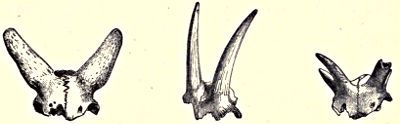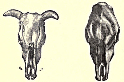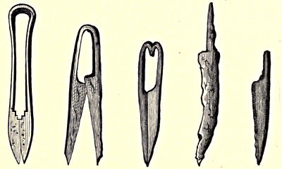 [191] There were also shears of various sizes; two well-formed needles of bronze; a shoemaker’s awl with blade of bronze and handle of stone; several axes or hatchets; a light spade of wood tipped with iron; an iron sword; a horse-shoe of ordinary size, thicker at the outer edge and without raised heels, but drawn out at the extremities to a great length; many whetstones; knives, very narrow and sharp at the point, but thick on the back; a bronze dish much scored, its diameter fifteen inches, including the rim; a wooden scoop; a large bead and small crescent-shaped piece of glass, which bore marks of having been set as a jewel; several pins of bronze, iron, bone, and wood, varying greatly in shape; the fragments of pottery were evidently the remains of strong, well-shaped vessels; the bones and horns of mammalia were principally those of oxen (of short-horn species), sheep, goat, deer, and dog; there were tusks of the boar, and in one instance the skull of a Cervus Elephas showed that the horns had been sawn off. In the museum of the College of Surgeons, London, is preserved the skull of an Irish deer from which the horns had been similarly cut, and it is said to have been found in that state in the west of Ireland.—Journal Royal Hist. and Arch. Asso. of Ireland, vol. iii., pp. 86, 90; vol. iv., pp. 36, 38.—E. Benn.