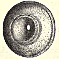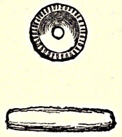[216] There were also found here a pair of quern-stones; burnt corn; numerous fragments of coarse earthenware vessels; fragments of thick dark glass; an earthen pot; a “grey-beard,” with the representation of a man’s head beneath the spout; worked oval stones; “spindle-whorls”; hones of different shapes and sizes; a brass token, almost defaced.
