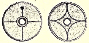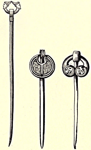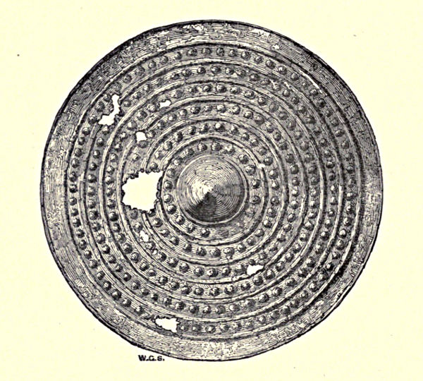 [230] Not far from Tullamore, on the direct route from the crannog of Lough Annagh to Killeigh, and under a considerable depth of bog, was found a very fine bronze pin, eleven inches long; it tapered to a sharp point at the end, and was headed with a disc, one and a-half inches in diameter, having an obtusely pointed boss in the centre.