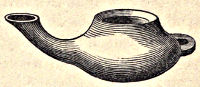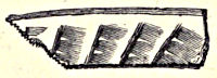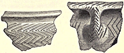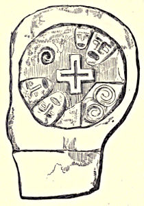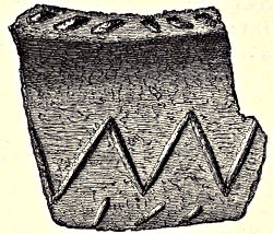 [186] Also the following articles: a circular stone not unlike the upper stone of a pot-quern; it was perforated in the centre, and decorated at the top. A small whorl of red grit, and a water-worn pebble that may have been used as a net weight or sinkstone (a). A whetstone, four inches long (a). A curved stone, five inches long, bearing on it some rudely carved devices (a). A celt-shaped, smooth, flat stone, about six inches in length, evidently a natural formation (a), and much resembling the modern polished stone used by linen weavers as a “rubbing-stone.” Two fragments of pottery, exceedingly rude, one of them unglazed (a): the first is portion of a small pipkin, between three and four inches wide, and two and three-quarter inches high, with an indented band round the top; it bears marks of the long-continued action of fire, and is in composition very like a cinerary urn.
