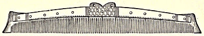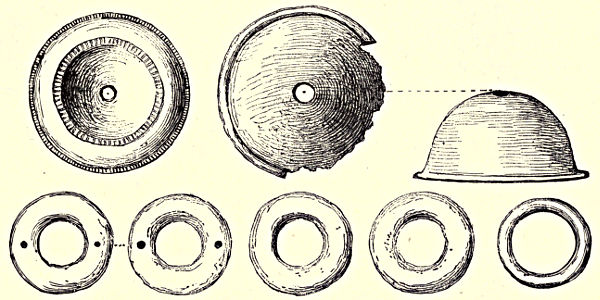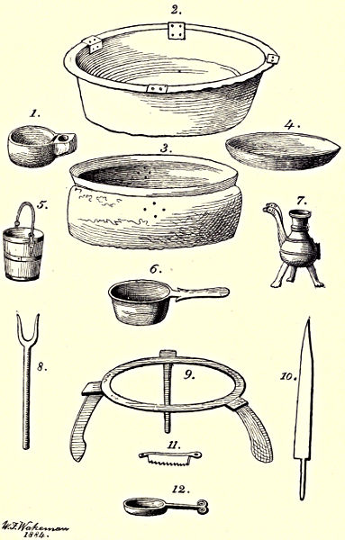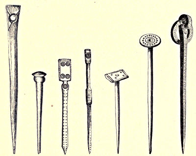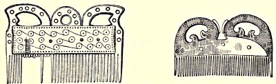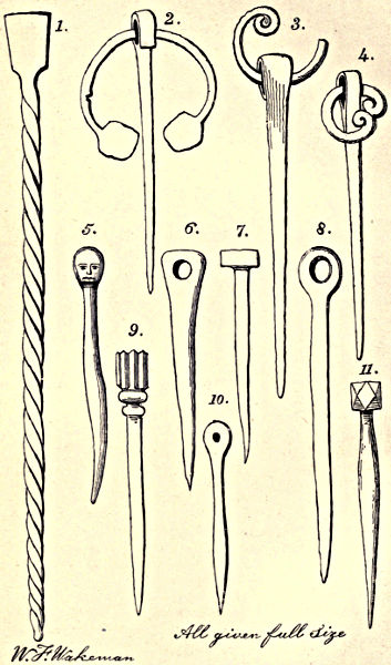 | Pins of iron, bronze, bone, and wood, &c. Iron shears and knives. Combs of bone and wood. Bronze tweezers. Stone and bronze ornaments: brooches, penannular rings, circlets, &c. Touchstones. Crucibles. Ornaments of gold and silver. Rings of stone, jet, and glass. Beads of stone, bone, jet, lead, earthenware, wood, and glass. | |