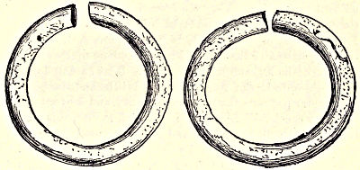 The following are a few of the articles found on this site, and nearly all are now in Museum, R. I. A.:—Two double-edged swords of iron. A curved blade. A peculiar single-edged weapon. An iron ring and chain, supposed to have formed portion of a manacle (plate VIII., p. 61). Two spear-heads in fine preservation (p. 63). An axe-head (p. 68). A bowl and a ladle (p. 85). A small single-edged knife. An iron pipe, with hook attached. A bronze object of unknown use (p. 143). Three armillæ of rude fashion; one of them formed of a thin plate measuring rather more than half an inch in diameter; the extremities slightly recurved. An ornament of mixed metal, and an enamelled plate of iron (p. 138). Portions of a small ring fibula, with cavities in the metal in which enamel appears to have been encrusted. Numerous bronze pins of various sizes and fashion. A skean or dagger (p. 65). A thin triangular blade, corroded at edges; the lower portion prolonged into a tang; the bevel on the edge, continued round the flat handle-plate, shows that the article was cast and not subsequently hammered out. A very rude piece of bronze somewhat resembling a broad arrow. A sling stone of quartz rock. An oblong or natural kidney-shaped stone, five inches long, and rounded at the extremities. Several whetstones. Two bone needles or bodkins, perforated at the extremity. A double-toothed comb, rudely ornamented with lines and concentric circles; and other combs, or fragments of same, one of them being a small perfect specimen, four inches long. A horn tine, polished at top. A very small four-sided drinking vessel of horn, two and a-half inches high. A polished leg-bone of a deer, curiously carved. A wooden spike, broad in the middle, and sharpened at each end; it is supposed to belong to the weapon class. There were also amber, jet, glass, and enamelled beads, now in the Museum, R. I. A.