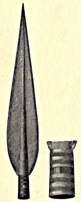 [242] In the Museum, R. I. A., Nos. 297 to 302, are stone celts from this crannog, and amongst the miscellaneous bone articles Nos. 1 to 4, and 18, are bone hafts or handles, one of them stained black, and ornamented by spiral and interrupted grooves. There are two horn tines, artificially shaped, and No. 40 is a shank-bone of a sheep or goat, stained black, highly polished, and perforated at one end. Besides the celebrated bronze shield described (ante, p. 71), the following antiquities are recorded as having been discovered in this site:—“A long, narrow, spear-head of bronze, in excellent preservation, the socket—circular in form—measuring nearly twenty-three inches in length, and two one-eighth inches in breadth at base of blade, along which there is a ridge with a feather edge running into flat compressed loops at the junction of blade and socket. A bronze spear-head, slightly defective in socket, but blade perfect; it was found with a portion of the charred handle remaining in it. A very small dagger-blade of bronze, with wide notches in the handle-plate. A bronze tube, probably the ferrule-end of a spear, and having a rivet-hole.”—Cat. Mus., R. I. A., pp. 487, 507-517.