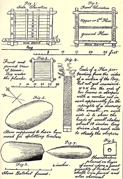 | Grain-rubbers. Querns. Human remains. Fireplaces on the shore. Pottery. Wooden vessels. Drinking cups. Wooden mallets. “Whorls.” Colouring-matter. Spinning. | |