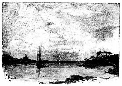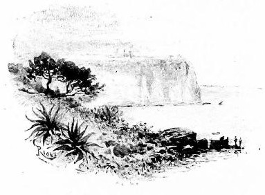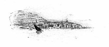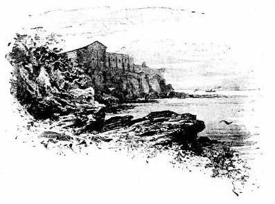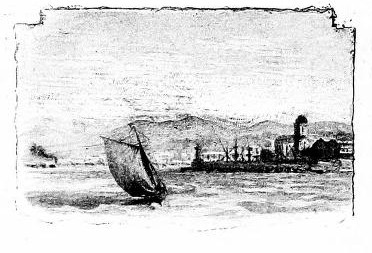 Further on, in the open sea, rises the castle of Saint-Honorat, which we had already perceived as we rounded the Cape of Antibes, and further on still, a line of reefs ended by a tower called "Les Moines."