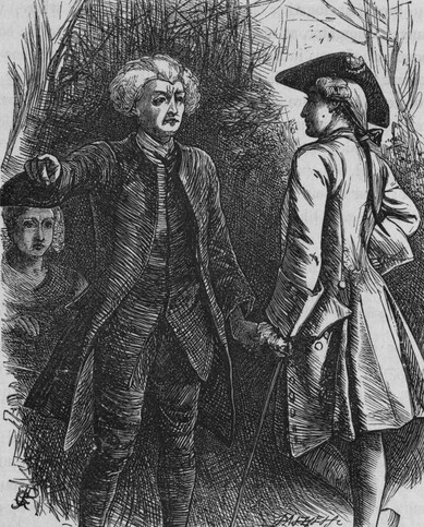 His departure only prepared the way for our own, which arrived a few days afterwards. The leaving a neighbourhood in which we had enjoyed so many hours of tranquillity was not without a tear, which scarcely fortitude itself could suppress. Besides, a journey of seventy miles, to a family that had hitherto never been above ten from home, filled us with apprehension; and the cries of the poor, who followed us for some miles, contributed to increase it. The first day's journey brought us in safety within thirty miles of our future retreat, and we put up for the night at an obscure inn in a village by the way. When we were shown a room, I desired the landlord, in my usual way, to let us have his company, with which he complied, as what he drank would increase the bill next morning. He knew, however, the whole neighbourhood to which I was removing, particularly Squire Thornhill, who was to be my landlord, and who lived within a few miles of the place. This gentleman he described as one who desired to know little more of the world than its pleasures, being particularly remarkable for his attachment to the fair sex. He observed, that no virtue was able to resist his arts and assiduity, and that there was scarcely a farmer's daughter within ten miles round but what had found him successful and faithless. Though this account gave me some pain, it had a very different effect upon my daughters, whose features seemed to brighten with the expectation of an approaching triumph; nor was my wife less pleased and confident of their allurements and virtue. While our thoughts were thus employed, the hostess entered the room to inform her husband that the strange gentleman, who had been two days in the house, wanted money, and could not satisfy them for his reckoning. "Want money!" replied the host, "that must be impossible; for it was no later than yesterday he paid three guineas to our beadle to spare an old broken soldier that was to be whipped through the town for dog-stealing." The hostess, however, still persisting in her first assertion, he was preparing to leave the room, swearing that he would be satisfied one way or another, when I begged the landlord would introduce me to a stranger of so much charity as he described. With this he complied, showing in a gentleman who seemed to be about thirty, dressed in clothes that once were laced. His person was well-formed, and his face marked with the lines of thinking. He had something short and dry in his address, and seemed not to understand ceremony, or to despise it. Upon the landlord's leaving the room, I could not avoid expressing my concern to the stranger at seeing a gentleman in such circumstances, and offered him my purse to satisfy the present demand. "I take it with all my heart, sir," replied he, "and am glad that a late oversight, in giving what money I had about me, has shown me that there are still some men like you. I must, however, previously entreat being informed of the name and residence of my benefactor, in order to repay him as soon as possible." In this I satisfied him fully, not only mentioning my name and late misfortune, but the place to which I was going to remove. "This," cried he, "happens still more luckily than I hoped for, as I am going the same way myself, having been detained here two days by the floods, which I hope, by to-morrow, will be found passable." I testified the pleasure I should have in his company, and my wife and daughters joining in entreaty, he was prevailed upon to stay supper. The stranger's conversation, which was at once pleasing and instructive, induced me to wish for a continuance of it; but it was now high time to retire and take refreshment against the fatigues of the following day.