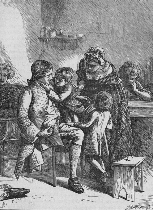 As we lived near the road, we often had the traveller or stranger visit us to taste our gooseberry-wine, for which we had great reputation; and I profess, with the veracity of an historian, that I never knew one of them find fault with it. Our cousins too, even to the fortieth remove, all remembered their affinity, without any help from the heralds' office, and came very frequently to see us. Some of them did us no great honour by these claims of kindred; as we had the blind, the maimed, and the halt amongst the number. However, my wife always insisted that, as they were the same flesh and blood, they should sit with us at the same table: so that if we had not very rich, we generally had very happy friends about us; for this remark will hold good through life, that the poorer the guest the better pleased he ever is with being treated; and as some men gaze with admiration at the colours of a tulip, or the wing of a butterfly, so I was by nature an admirer of happy human faces. However, when any one of our relations was found to be a person of a very bad character, a troublesome guest, or one we desired to get rid of, upon his leaving my house I ever took care to lend him a riding-coat, or a pair of boots, or sometimes a horse of small value, and I always had the satisfaction of finding he never came back to return them. By this the house was cleared of such as we did not like; but never was the family of Wakefield known to turn the traveller or the poor dependent out of doors.