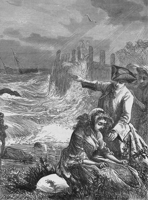 My attention was so much taken up by Mr. Burchell's account, that I scarcely looked forward as we went along, till we were alarmed by the cries of my family; when, turning, I perceived my youngest daughter in the midst of a rapid stream, thrown from her horse, and struggling with the torrent. She had sunk twice, nor was it in my power to disengage myself in time to bring her relief. My sensations were even too violent to permit my attempting her rescue: she must have certainly perished, had not my companion, perceiving her danger, instantly plunged in to her relief, and, with some difficulty, brought her in safety to the opposite shore. By taking the current a little farther up, the rest of the family got safely over, where we had an opportunity of joining our acknowledgments to hers. Her gratitude may be more readily imagined than described: she thanked her deliverer more with looks than words, and continued to lean upon his arm, as if still willing to receive assistance. My wife also hoped one day to have the pleasure of returning his kindness at her own house. Thus, after we were refreshed at the next inn, and had dined together, as Mr. Burchell was going to a different part of the country, he took leave; and we pursued our journey, my wife observing, as he went, that she liked him extremely, and protesting that, if he had birth and fortune to entitle him to match into such a family as ours, she knew no man she would sooner fix upon. I could not but smile to hear her talk in this lofty strain; but I was never much displeased with those harmless delusions that tend to make us more happy.