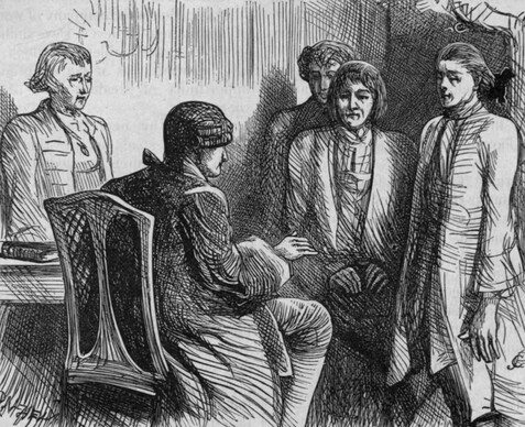 The temper of a woman is generally formed from the turn of her features; at least it was so with my daughters. Olivia wished for many lovers; Sophia to secure one. Olivia was often affected, from too great a desire to please; Sophia even repressed excellence, from her fear to offend. The one entertained me with her vivacity when I was gay, the other with her sense when I was serious. But these qualities were never carried to excess in either, and I have often seen them exchange characters for a whole day together. A suit of mourning has transformed my coquette into a prude, and a new set of ribands has given her younger sister more than natural vivacity. My eldest son, George, was bred at Oxford, as I intended him for one of the learned professions. My second boy, Moses, whom I designed for business, received a sort of miscellaneous education at home. But it is needless to attempt describing the particular characters of young people that had seen but very little of the world. In short, a family likeness prevailed through all; and, properly speaking, they had but one character—that of being all equally generous, credulous, simple, and inoffensive.