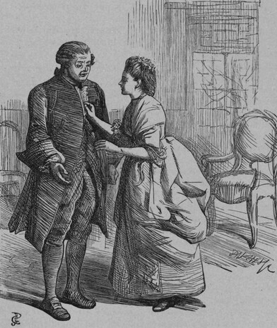 And now our poet resolved to try his powers in a new field—to write a comedy, the remuneration for which should pay off the debts that were fast accumulating round him. But here fresh vexation and new care awaited him. Garrick, the great actor and prosperous manager, to whom he offered the play, took upon himself the office of critic and emendator, authoritatively suggested the entire omission of Lofty, one of the best characters, and, to use an expressive vulgarism, seemed inclined to "burke" the comedy altogether. Goldsmith, smarting under the actor's patronizing criticism, became angry, refused to alter or amend the play, and finally took the manuscript out of Garrick's hands, and transferred it to the rival management of Colman at Covent Garden. But Colman, though he accepted the piece, had little or no hope that it would be a success; and he contrived to impart his own doubts and misgivings to the whole company. The fact was, that, at this period, sentimental comedy, showing men and women as they appear in the pages of novelists of a certain school, but not as they walk and talk in real life, was in the ascendant; and Hugh Kelly—a man with some ingenuity, but without a spark of genius—was the great representative of this school of writing. Now Goldsmith held that a comedy should be comic—that it should, above all things, amuse the spectators by humourous dialogue and startling action; and, in his dramatic creed, the enunciation of moral platitudes had no place. In fact, the lines Goldsmith afterwards wrote concerning Cumberland, Kelly's successor in the Sentimental School of Comedy, might well have been applied to Kelly himself: