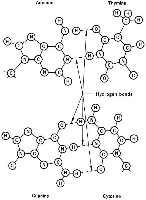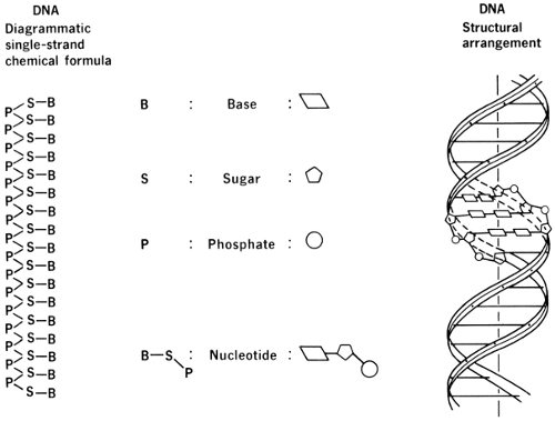 Figure 11 is a diagram showing the essential structure of the large DNA molecule. According to the Watson-Crick model,[7] the molecule consists of two strands of smaller molecules twisted around each other to form a double helix. Each strand consists of a sequence of the smaller molecules linked linearly to each other. These smaller molecules are called nucleotides, and each consists of three still smaller molecules, a sugar (deoxyribose), phosphoric acid, and a nitrogen base. Each nucleotide and its nearest neighbor are linked together (between the sugar of one and the phosphoric acid of the neighbor). This leaves the nitrogen base free to attach itself, through hydrogen bonding, to another nitrogen base in the opposite strand of the helix.