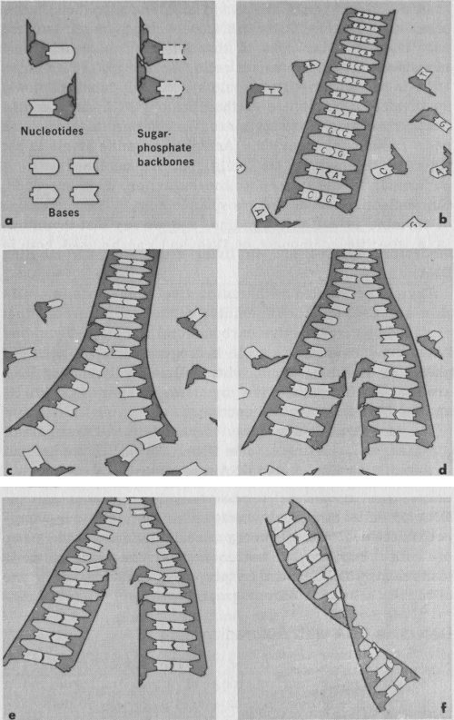 Figure 13 The DNA molecule and how it replicates. (a) The constituent submolecules. (b) Assembly of subunits in complete DNA molecule. (c) “Unzipping” of the double nucleotide strand. (d) and (e) The forming of a new strand by each individual strand. (f) DNA molecule in twisted double-strand configuration.