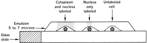 The condition of close contact between cells and emulsion is achieved by the technique of dip-coating autoradiography. In this process the glass slide on which the cells are carried is dipped into a melted photographic emulsion (see Figure 15a), a thin film of which clings to the slide. After it has been dried, the slide is placed in a lighttight box and kept in a refrigerator for the desired period of exposure, usually several days or weeks. During this period disintegrating radioactive atoms within the cells continue to emit beta particles, which, in turn, produce a latent image in the overlying emulsion. After the exposure is 23 complete, the slide is developed and fixed like a photographic plate, and a stain is applied which penetrates the emulsion so that the outlines of the cells and their internal structures can be seen. The fixing process removes all silver bromide that has not been ionized so that the emulsion is reduced to a thin, transparent film of gelatin covering the stained cells and containing only the clusters of silver grains that were struck by the beta particles.