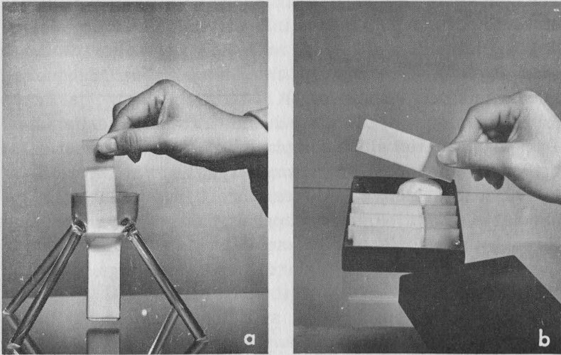 Figure 15 Cells being prepared for autoradiography. (a) Cells being coated with a photographic emulsion. (b) Coated cells being exposed to produce a latent image.